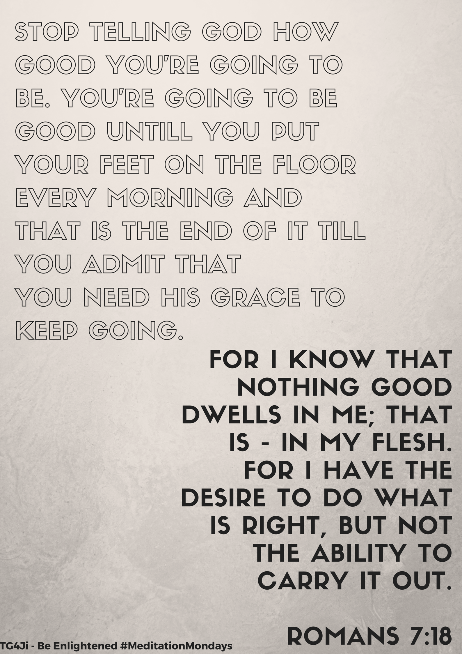 Stop telling God how good you are going to be today, you are going to be good until you put your feet on the ground each morning and that is the end of it because the flesh takes over and you will need his grace to defeat the temptation to not be good from that point onwards.
