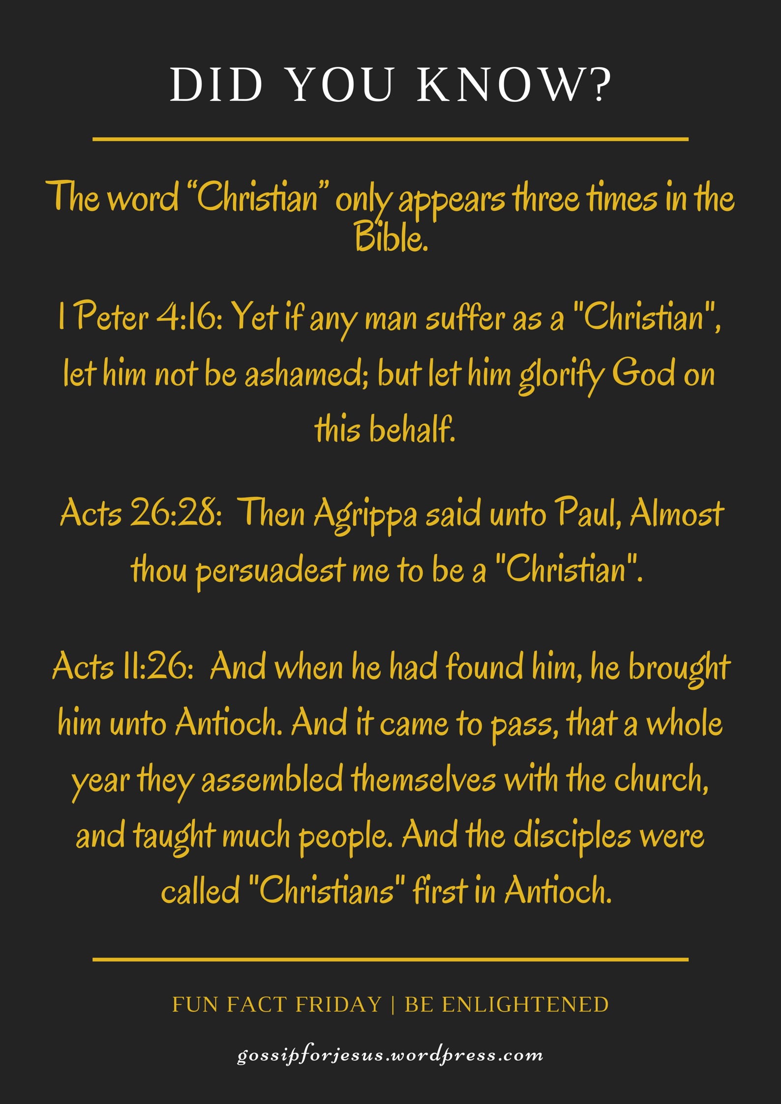We use the word “Christian” a lot to identify with Jesus and His teachings but did you know it only appears 3 times, (Yes! that’s right, only THREE times!!) in the Bible?