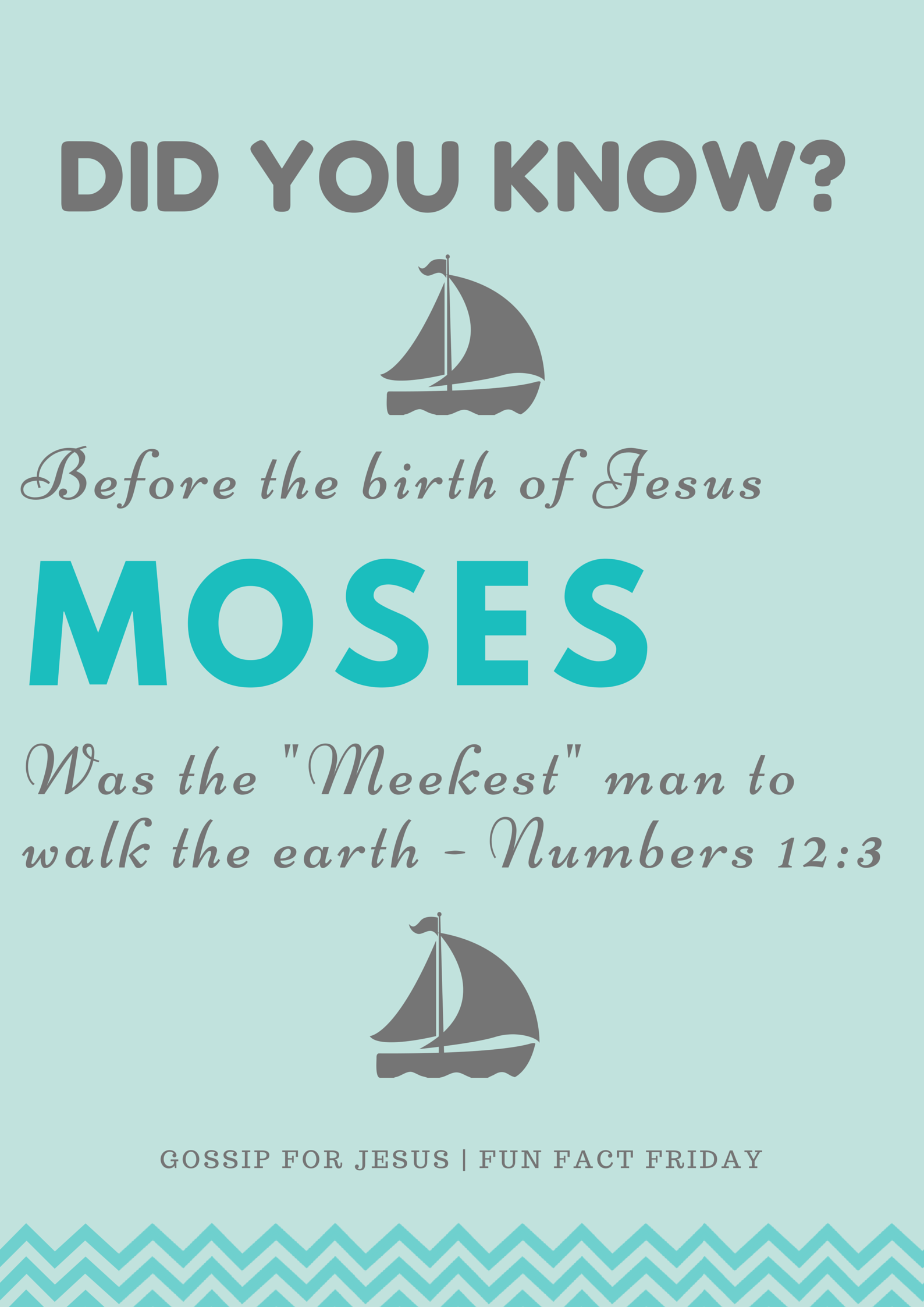 The Meekest Man on Earth. faithoplov / May 8, 2015 #FunFactFriday – Because TGIF! Numbers 12:3 – Now the man Moses was very meek, above all the men which were upon the face of the earth. Have a wonderful weekend everyone! God Bless you! Share this: Share on X (Opens in new window) X Share on LinkedIn (Opens in new window) LinkedIn Share on Facebook (Opens in new window) Facebook Email a link to a friend (Opens in new window) Email Share on Pinterest (Opens in new window) Pinterest Print (Opens in new window) Print Share on Tumblr (Opens in new window) Tumblr Share on Reddit (Opens in new window) Reddit Share on WhatsApp (Opens in new window) WhatsApp Like Loading...