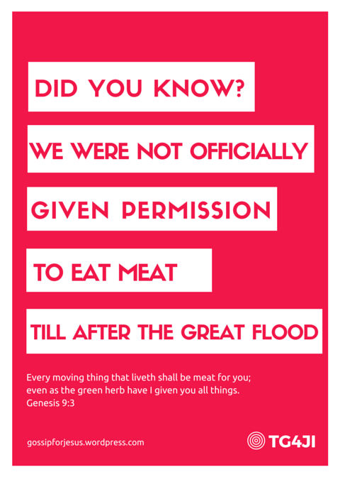 Vegetarian? faithoplov / May 29, 2015 #FunFactFriday – Because TGIF! Did you know we were not officially given permission to eat meat till after the great flood? Share this: Share on X (Opens in new window) X Share on LinkedIn (Opens in new window) LinkedIn Share on Facebook (Opens in new window) Facebook Email a link to a friend (Opens in new window) Email Share on Pinterest (Opens in new window) Pinterest Print (Opens in new window) Print Share on Tumblr (Opens in new window) Tumblr Share on Reddit (Opens in new window) Reddit Share on WhatsApp (Opens in new window) WhatsApp Like Loading...
