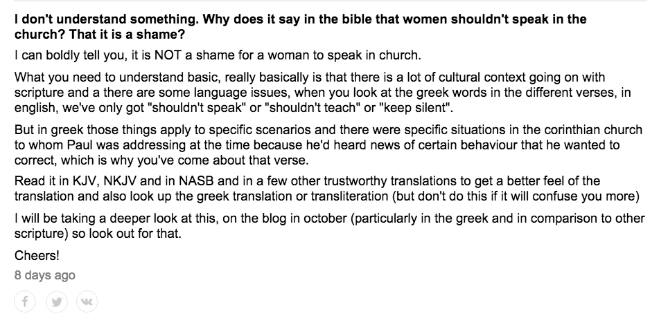 Just to let you know right away, that topic was just to lure most of you back here since we’ve been absent. The real deal is that someone asked on ask.fm about it being shameful for women to talk in church and although a short answer was provided there, we thought it best to look at the issue in more detail and context. Our real question today therefore is: