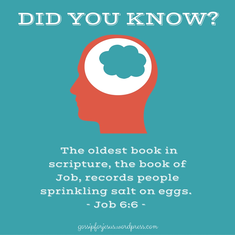 Salt on Eggs. faithoplov / October 23, 2015 #FunFactFriday – Because TGIF! Did you know, The oldest book in scripture, the book of Job, records people sprinkling salt on eggs. Can flavorless food be eaten without salt? Or is there any taste in the white of an egg? — Job 6:6 (NKJV) Selah! Share this: Share on X (Opens in new window) X Share on LinkedIn (Opens in new window) LinkedIn Share on Facebook (Opens in new window) Facebook Email a link to a friend (Opens in new window) Email Share on Pinterest (Opens in new window) Pinterest Print (Opens in new window) Print Share on Tumblr (Opens in new window) Tumblr Share on Reddit (Opens in new window) Reddit Share on WhatsApp (Opens in new window) WhatsApp Like Loading...